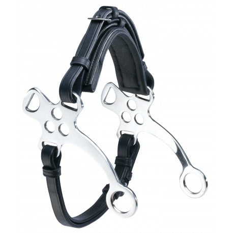 Avec muserolle matelassée large et gourmette en cuir vachette anglais.