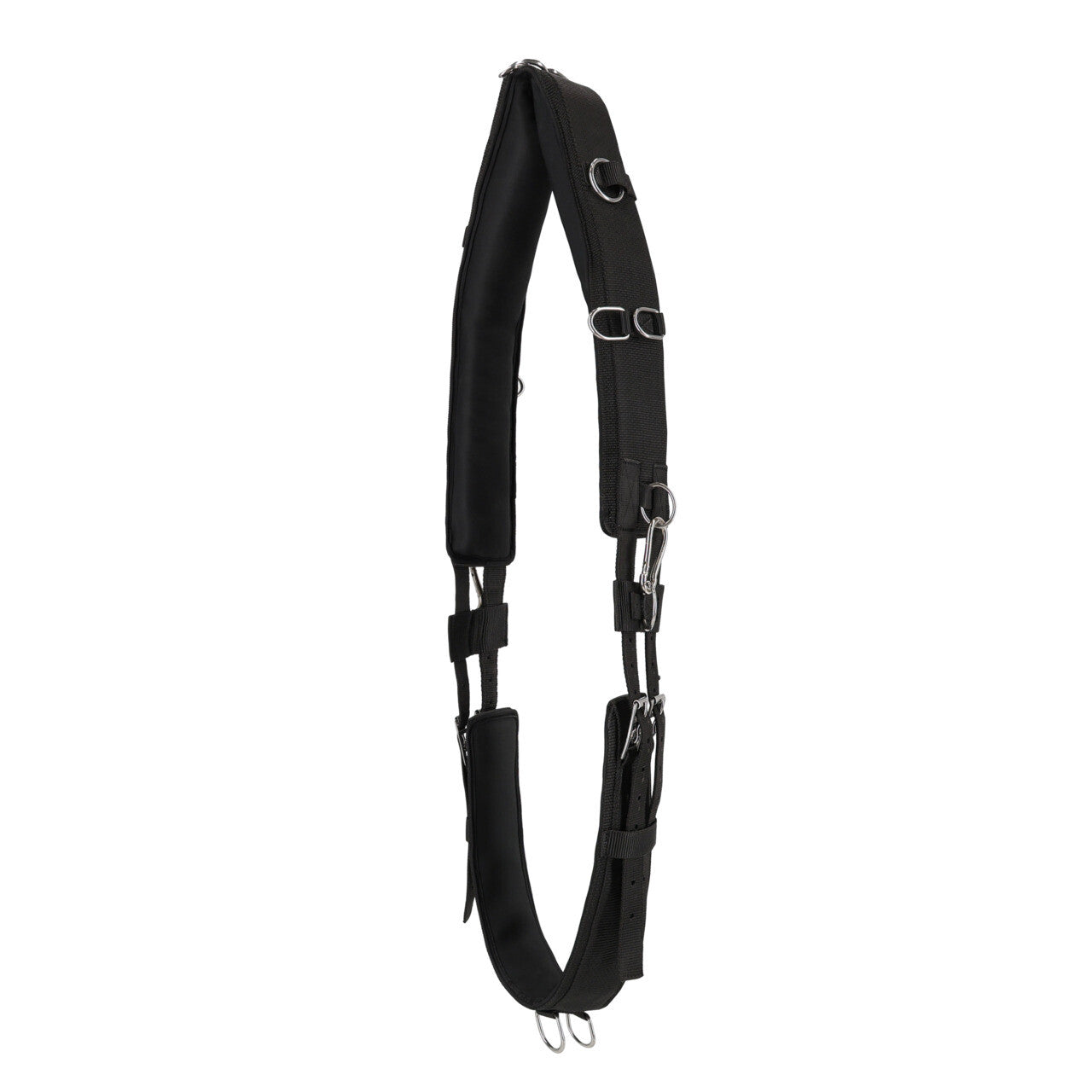 Sangle de longe avec rembourrage doux, équipée de 11 anneaux pour la fixation d'aides à la longe. L'anneau inférieur est réglable des deux côtés pour des options de réglage supplémentaires. Comprend une sangle avec un rembourrage doux, réglable des deux côtés avec des boucles à rouleaux.